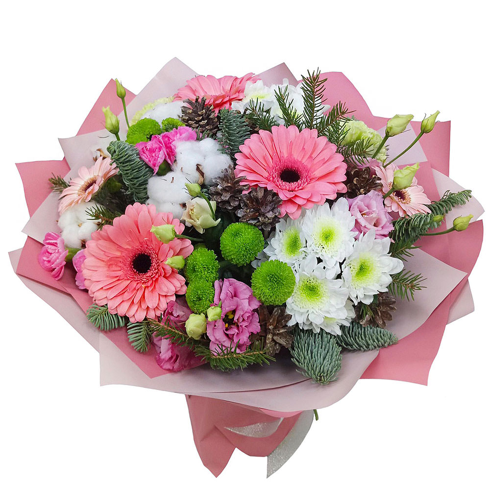 На фото представлен образец. Объем букета зависит от выбранного вами размера. Точное количество цветов и цветовую гамму вы можете уточнить у менеджера по телефону.