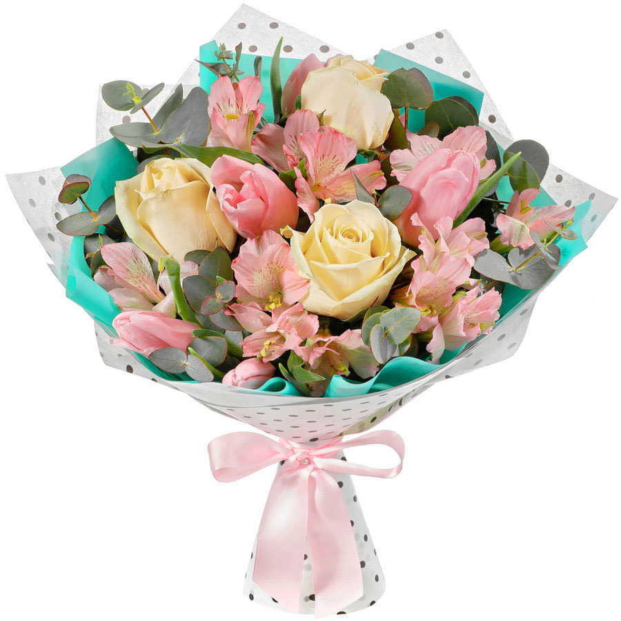 На фото представлен образец. Объем букета зависит от выбранного вами размера. Точное количество цветов и цветовую гамму вы можете уточнить у менеджера по телефону.