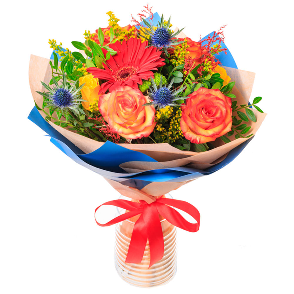 На фото представлен образец. Объем букета зависит от выбранного вами размера. Точное количество цветов и цветовую гамму вы можете уточнить у менеджера по телефону.