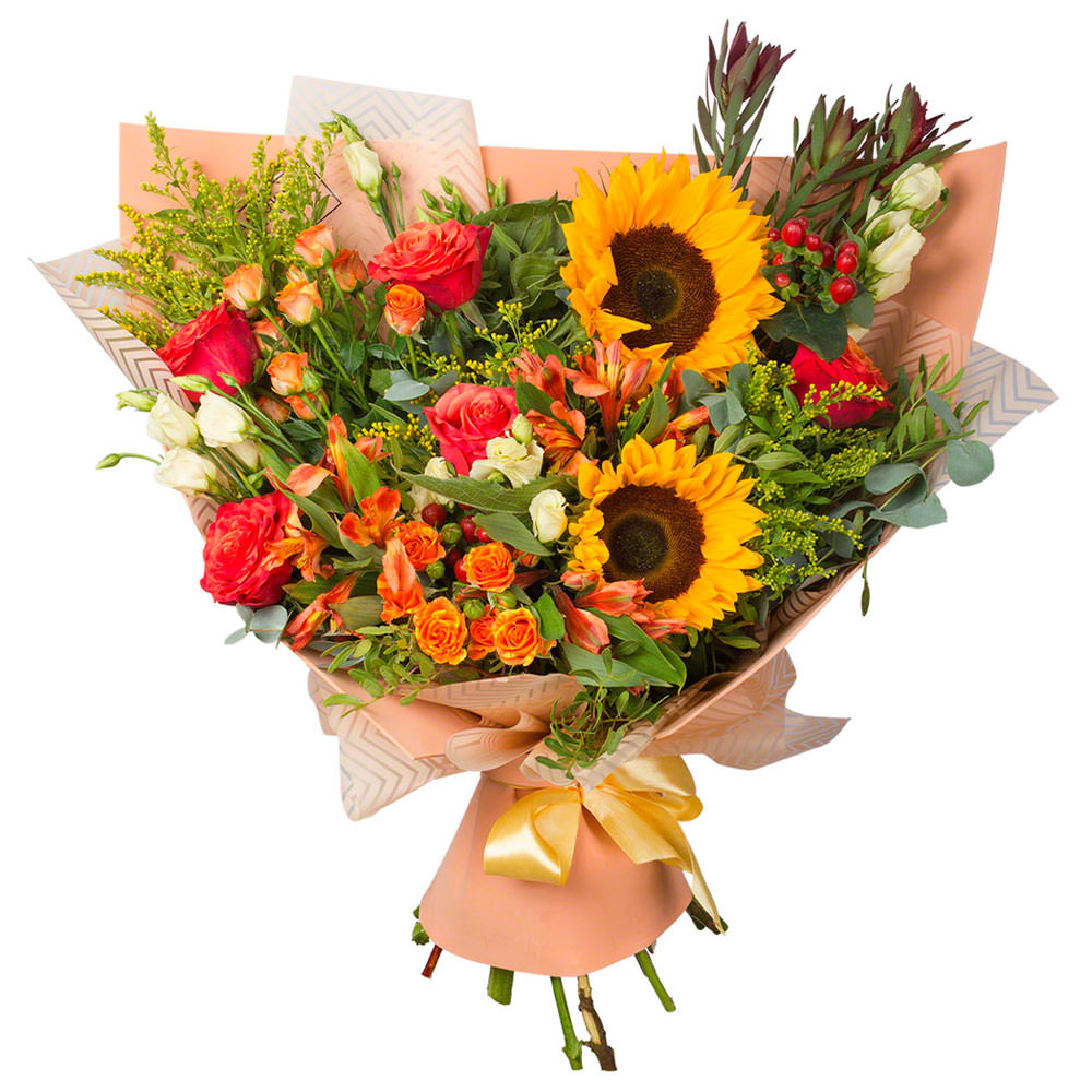 На фото представлен образец. Объем букета зависит от выбранного вами размера. Точное количество цветов и цветовую гамму вы можете уточнить у менеджера по телефону.