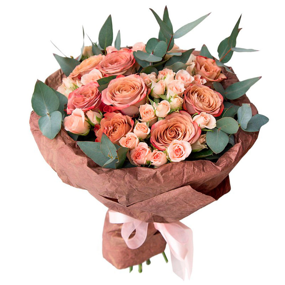 На фото представлен образец. Объем букета зависит от выбранного вами размера. Точное количество цветов и цветовую гамму вы можете уточнить у менеджера по телефону.