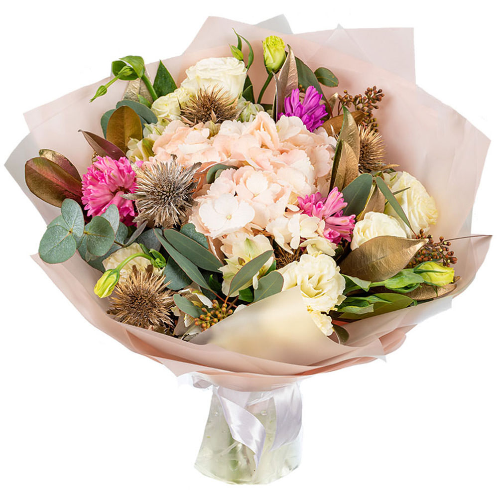 На фото представлен образец. Объем букета зависит от выбранного вами размера. Точное количество цветов и цветовую гамму вы можете уточнить у менеджера по телефону.