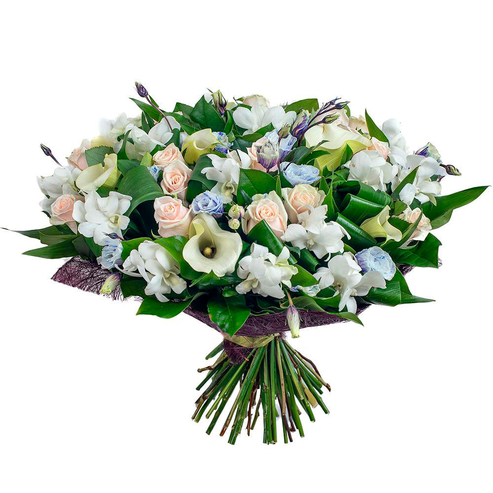 На фото представлен образец. Объем букета зависит от выбранного вами размера. Точное количество цветов и цветовую гамму вы можете уточнить у менеджера по телефону.