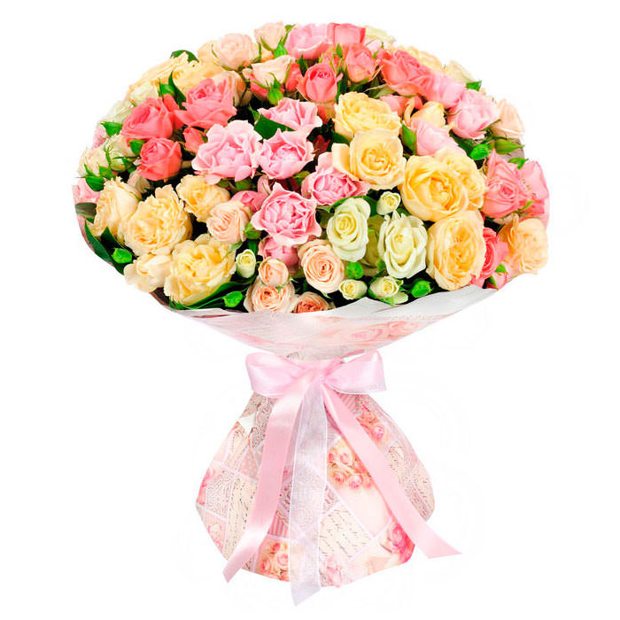 На фото представлен образец. Объем букета зависит от выбранного вами размера. Точное количество цветов и цветовую гамму вы можете уточнить у менеджера по телефону.