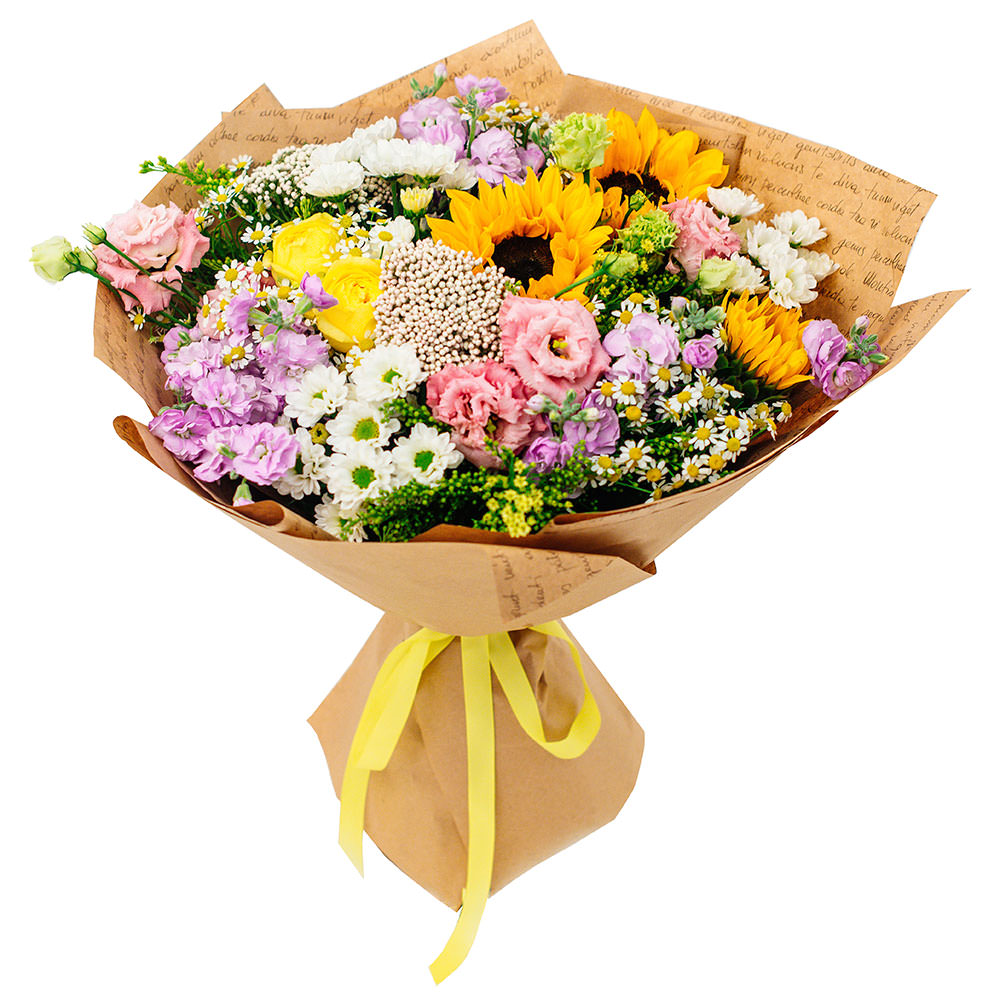 На фото представлен образец. Объем букета зависит от выбранного вами размера. Точное количество цветов и цветовую гамму вы можете уточнить у менеджера по телефону.