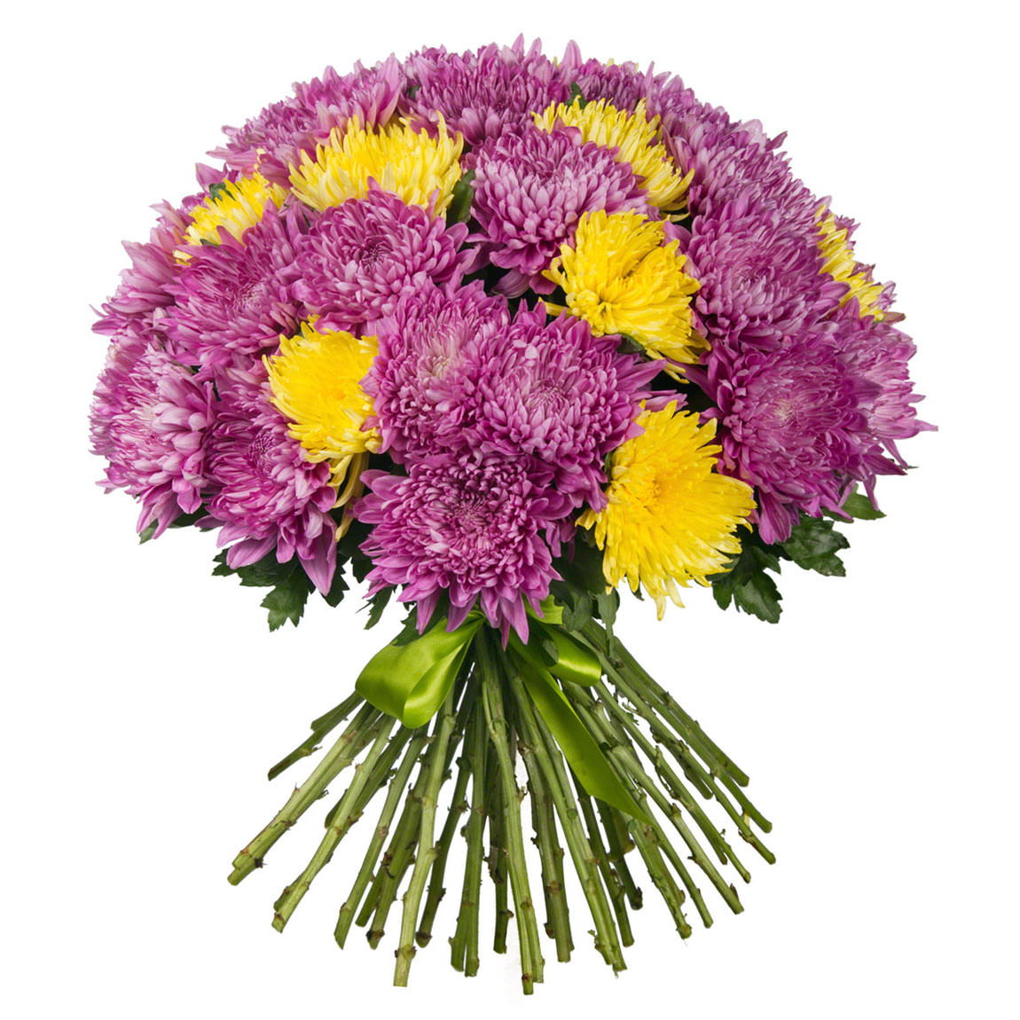 Одноголовые желтые, фиолетовые хризантемы: