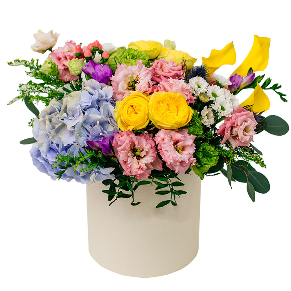 На фото представлен образец. Объем коробки зависит от выбранного вами размера. Точное количество цветов и цветовую гамму вы можете уточнить у менеджера по телефону.