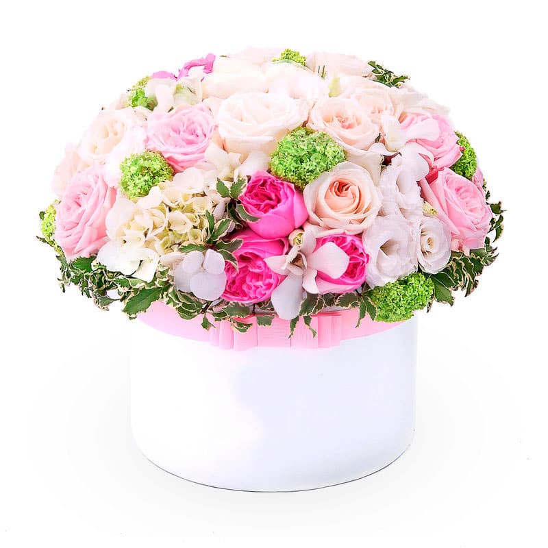 На фото представлен образец. Объем коробки зависит от выбранного вами размера. Точное количество цветов и цветовую гамму вы можете уточнить у менеджера по телефону.