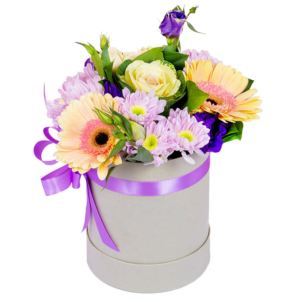 На фото представлен образец. Объем коробки зависит от выбранного вами размера. Точное количество цветов и цветовую гамму вы можете уточнить у менеджера по телефону.